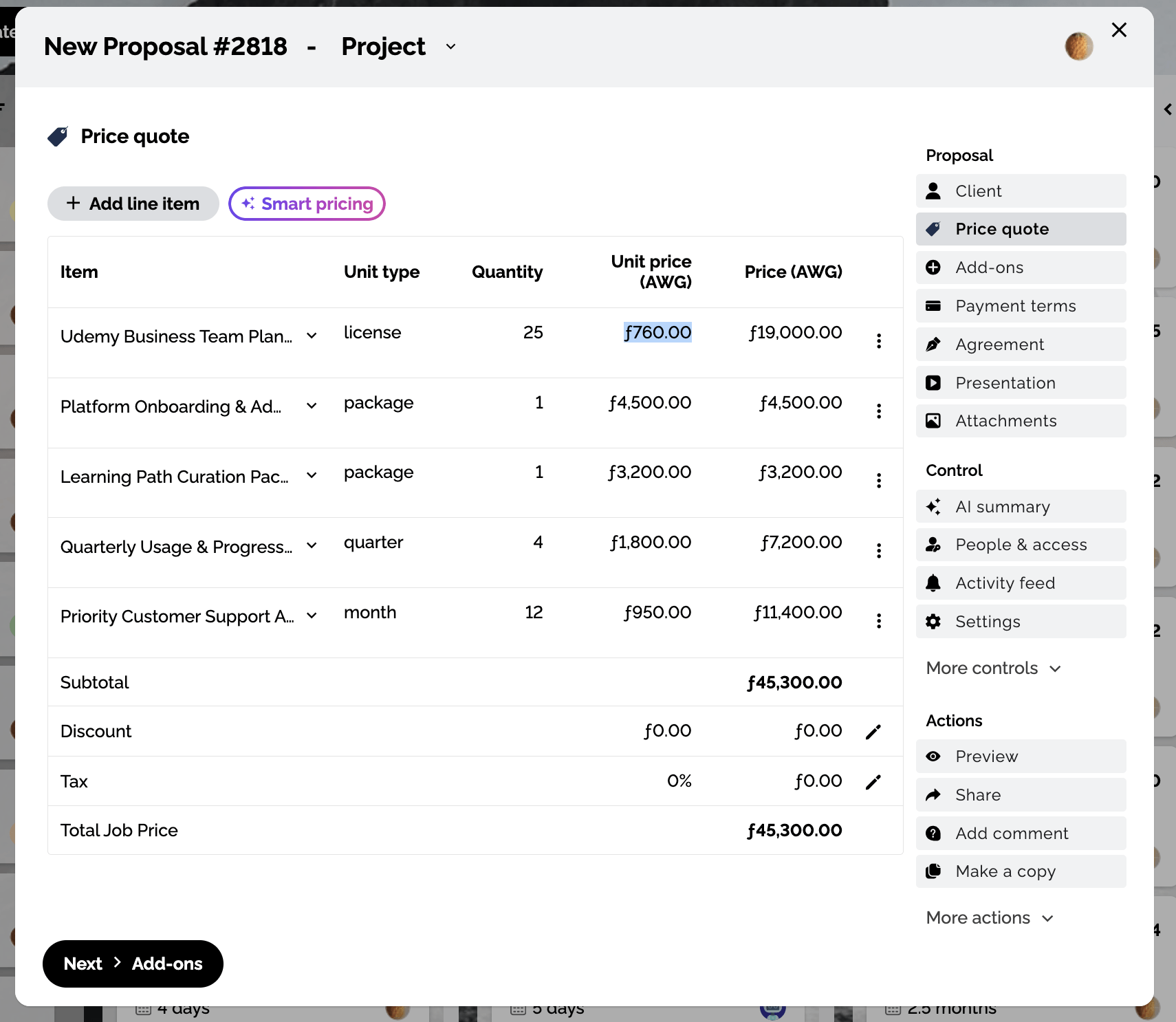 - In the Business Portal, open Workspaces → Proposal→ "Price quote" or "Add-ons".