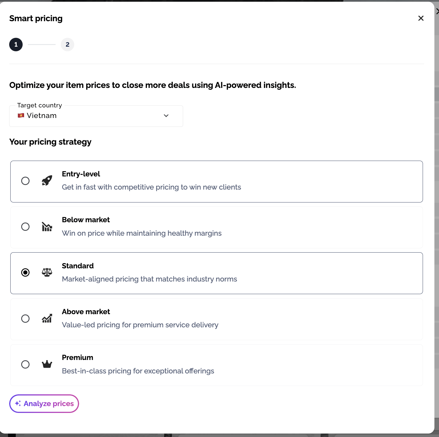 Use "✨ Smart pricing" to review AI pricing suggestions for your line items based on a target country and pricing strategy, then apply the updates you want before saving.
