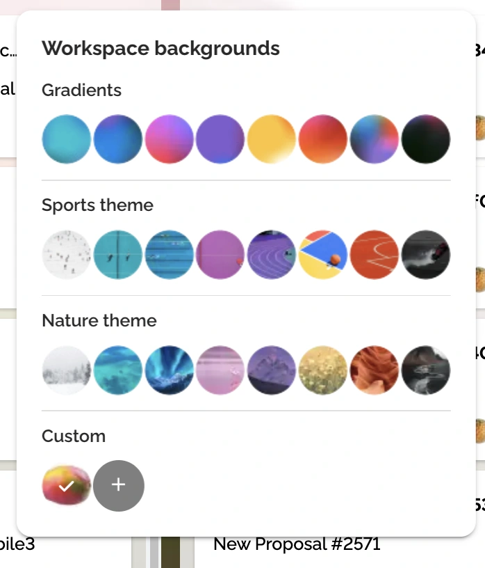 You can add a custom background to a Workspace from the Workspace backgrounds picker. Custom backgrounds appear in the "Custom" section.