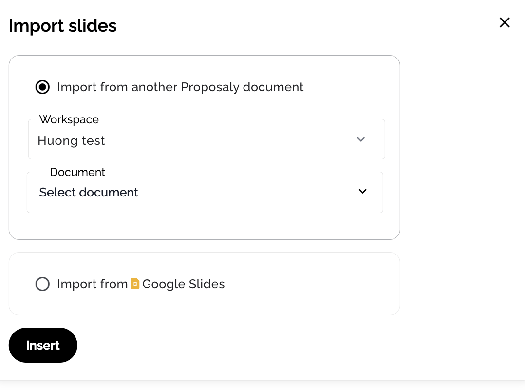 - For "Import from another Proposaly document", choose a "Workspace" and a "Document". The "Workspace" field defaults to the current workspace.