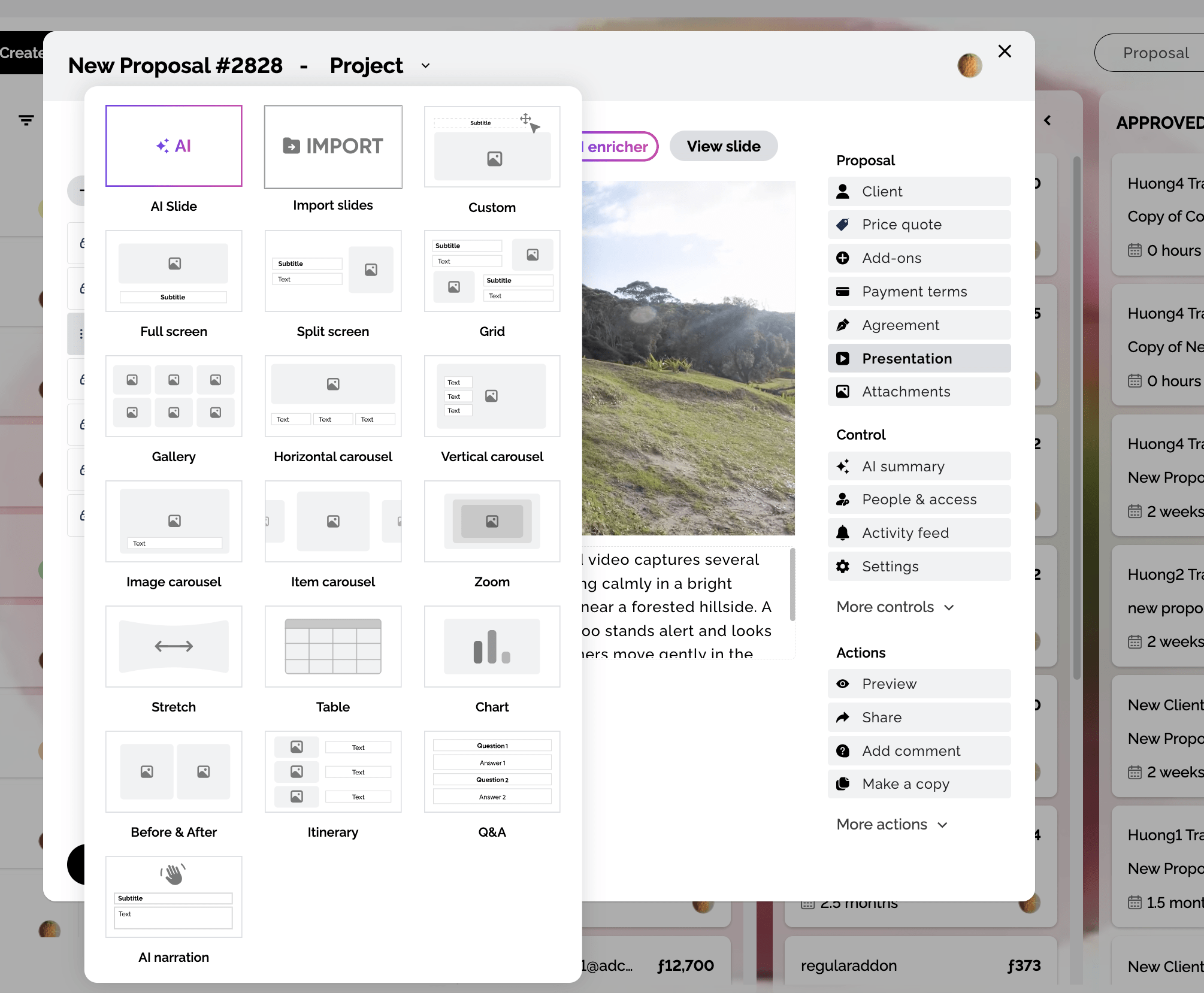 Import slides into a Presentation from another Proposaly document or from Google Slides. You can preview slides, choose which ones to import, and apply optional enhancements before importing.