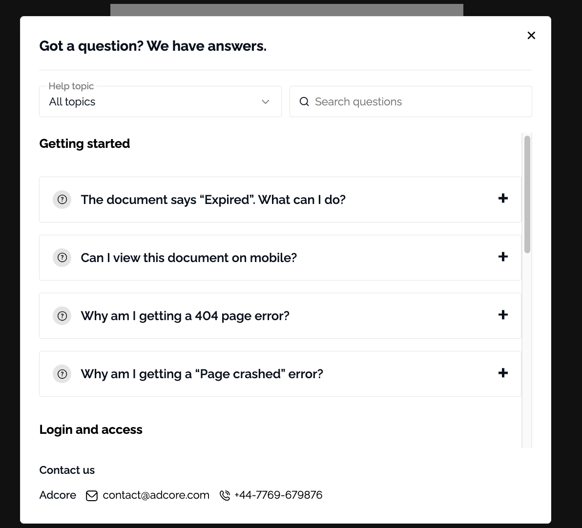 - In the Help dialog, use "Help topic" to filter questions. You can also use "Search questions" to find a specific answer.