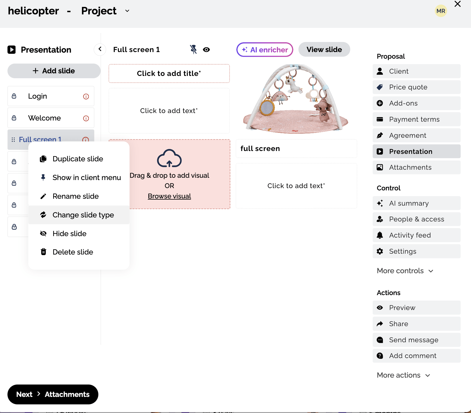 - Optional: Select "Enrich slide content using AI" if you want AI to rewrite, shorten, or expand the content to fit the new slide type.